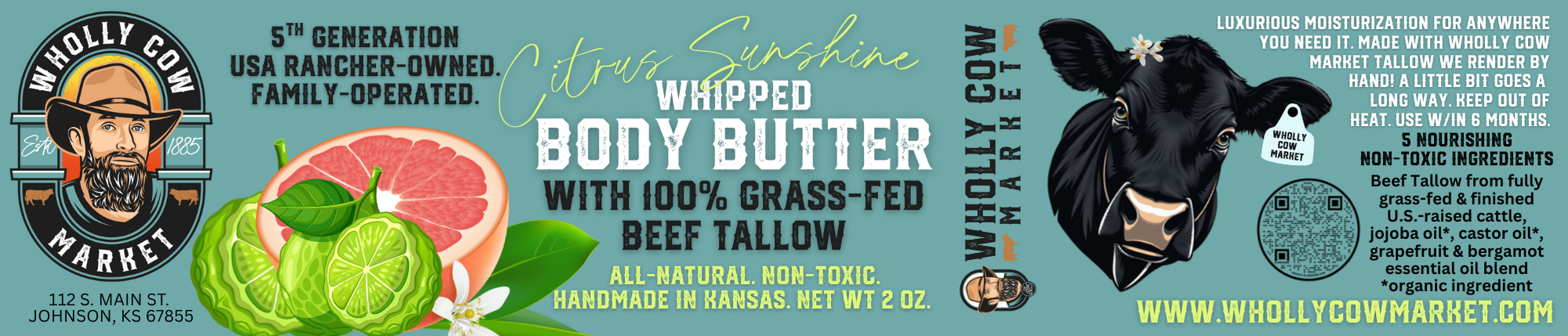 Enjoy our luxurious, refreshing beef tallow body butter in Citrus Sunshine scent. Perfect for spring, summer or anytime your skin need a nourishing lift. We're proud to say all our tallow products are handmade in Kansas with beef tallow from cattle raised on our farm. Check out our short, all-natural, non-toxic ingredient list below.